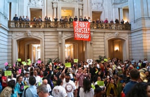Hispanic groups storm San Francisco City Hall to protest the proposed Mission housing project supported by Trauss and the yimbys. Photograph: Kyle Smeallie