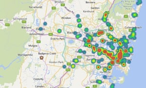 A heatmap of cranes in Sydney in the fourth quarter of 2017. Photograph: Rider Levett BucknallShe believes many people would accept more density if it meant they also got more frequent transport services, more school places, a better choice of shops and services and improved housing affordability.